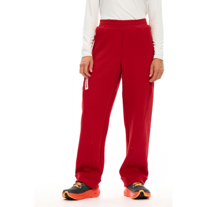 Хлопок с добавлением полиэстера и спандекса сохраняет тепло и хорошо дышит. У женских брюк «Хаг» свободный силуэт, по низу штанин – широкие простроченные манжеты. Посадка регулируется при помощи брендированной ленты в поясе.
