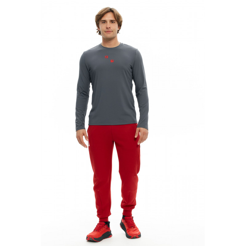 Лонгслив выполнен из легкого эластичного материала с особым плетением на изнаночной стороне, благодаря которому он отлично сохраняет тепло и отводит влагу.